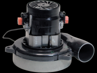 In Bypass motors the work is independant from the cooling air. A separate fan is used to direct cooling air over the armature and field. Manufacturers should ensure that the cooling air does not mix with the vacuum or blower air. Cooling air is typically mad available through a egress in the equipment housing. Bypass motors come in two configurations: Peripheral Bypass and Tangential Bypass. The method a manufacturer chooses depends on the method of mounting and air ducting geometry. Because the work air does not travel across the motor at all, this style motor is a dependable choice for wet pickup applications such ar scrubbers and carpet extraction.